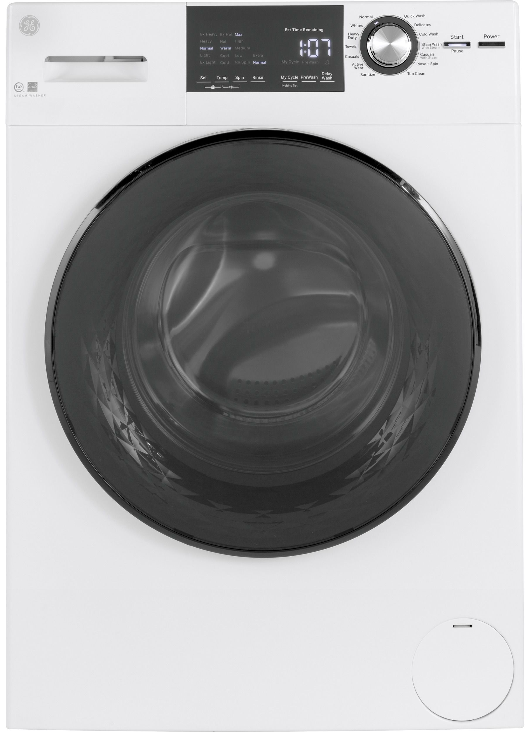 GE® White Front Load Washer with 2.8 Cu. Ft. total capacity, stainless steel basket, electronic touch controlsRead More