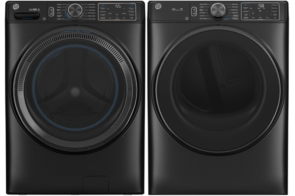 GE® Carbon Graphite Front Load Laundry Pair with a 5.8 cu. ft. capacity front load washer and a 7.8 cu. ft. capacity front load electric dryer.Read More