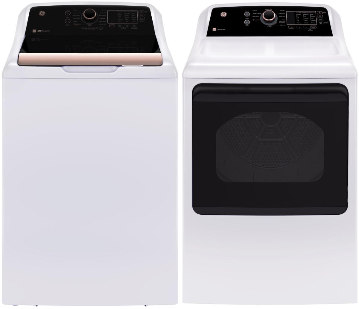 GE® White and Rose Gold Top Load Laundry Pair with a 5.3 cu. ft. capacity top load washer and a 7.4 cu. ft. capacity top load electric dryerRead More
