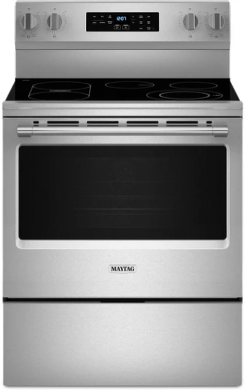 Sturdy door hinges on this Maytag® electric range are built for dependability, while the fingerprint resistant stainless finish and ceramic glass cooktop help make cleaning easy.