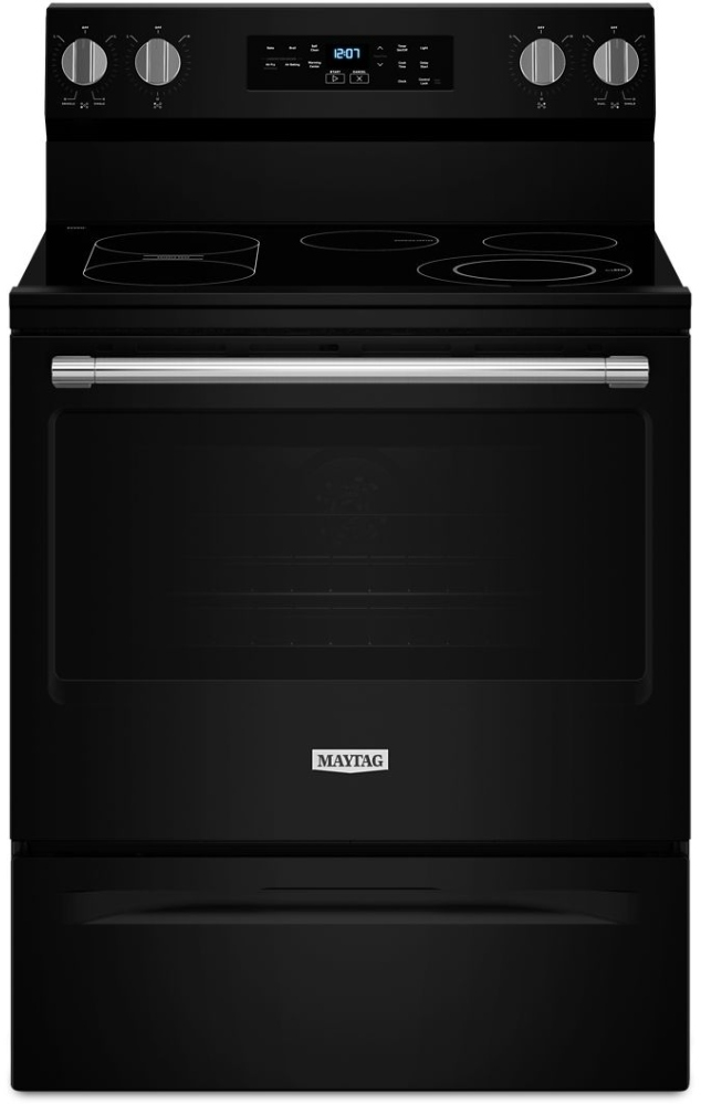 Sturdy door hinges on this Maytag® electric range are built for dependability, while the fingerprint resistant stainless finish and ceramic glass cooktop help make cleaning easy.