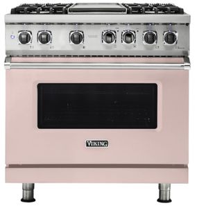 The Viking® Blush 36" Self Cleaning Liquid Propane Dual Fuel Range combines luxury and performance. Featuring a spacious gas cooktop, an self-cleaning oven, and a built-in griddle, it offers precise cooking control and a stylish finish for any kitchen.Read More