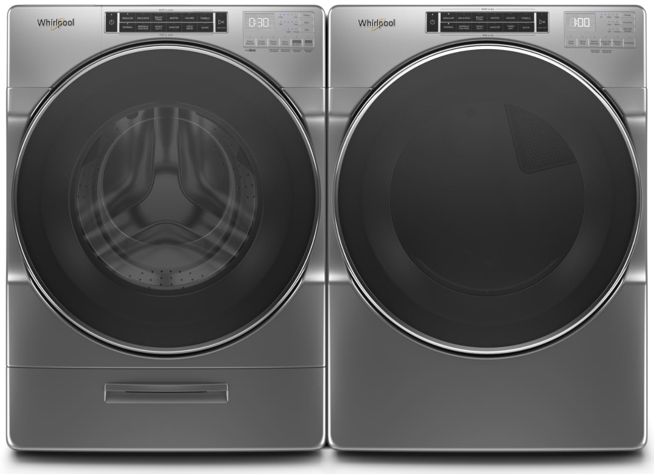 Whirlpool® Chrome Shadow Front Load Laundry Pair with a 5.8 cu. ft. capacity washer and 7.4 cu. ft. capacity gas dryer.Read More